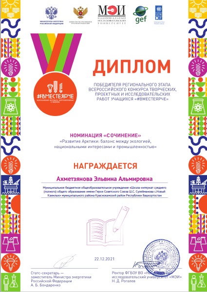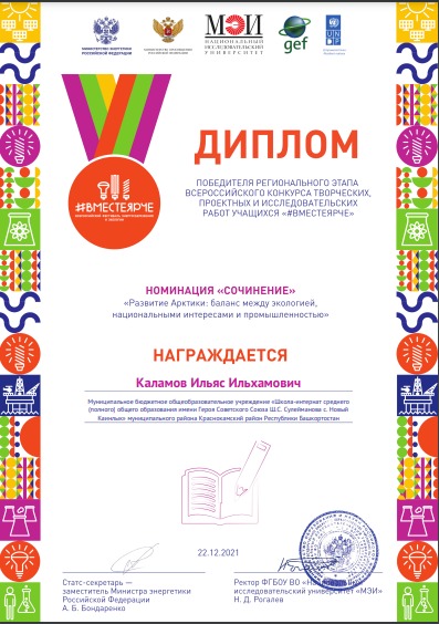 Подведены итоги регионального этапа Всероссийского конкурса творческих, проектных и исследовательских работ учащихся «#Вместе ярче-2021». Каламов Ильяс, ученик 5 класса (руководитель Фаррахова А.Ф.) и Ахметзьянова Эльвина, ученица 8 класса (руководитель Глимьянова А.Ш.) стали Победителями в номинации «Развитие Арктики: баланс между экологией, национальными интересами и промышленностью» .Руководители работ награждены Благодарственными письмами Министерства энергетики РФ и Национального исследовательского энергетического университета г.Москва за высокий уровень педагогического мастерства, проявленной при подготовки проектов.